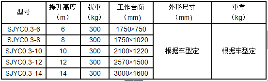 產(chǎn)品規格:車(chē)載式液壓升降平臺根據升降高度可分為:6、8、10、12、14升降平臺,設備載重300公斤至500公斤??蛻?hù)可根據需求選用解放、東風(fēng)、輕騎、福田、電瓶車(chē)等任何車(chē)型,設備直接采用汽車(chē)或電瓶的直接動(dòng)力升降。