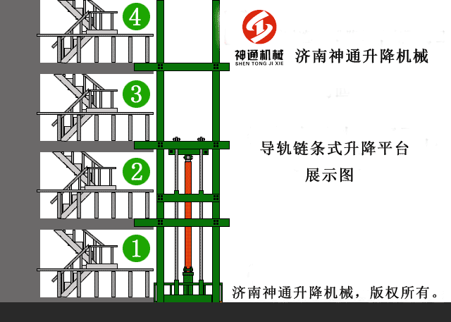 導軌鏈條式升降平臺主要用各種工作層間貨物上下運送;立體車(chē)庫和地下車(chē)庫二層以上高樓間、無(wú)法開(kāi)挖地坑場(chǎng)所、頂層高度不能到達要求的場(chǎng)合等比較難解決的狹小空間,濟南神通升降機械有限公司將竭盡全力為你打量身打造高效率的液壓升降平臺。電動(dòng)升降機設有安全的液壓系統設置防墜、上下層門(mén)互動(dòng)連鎖,各樓層和升降平臺工作臺面均可設置操作按鈕,實(shí)現多點(diǎn)控制。電動(dòng)升降機結構堅固,承載量大,升降平穩,安裝維護簡(jiǎn)單方便,是經(jīng)濟實(shí)用的低樓層間替代電梯的理想貨物輸送設備。 根據升降貨梯的安裝環(huán)境和使用要求,選擇不同的可選配置,可取得更好的使用效果。